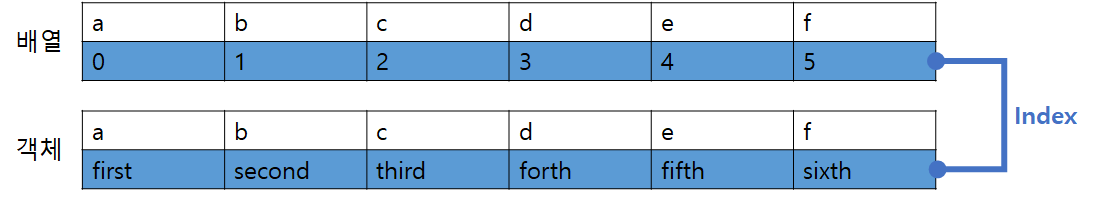 객체(object)는 인덱스에 문자열을 쓸 수 있음 -> 우리가 원하는 데이터를 인덱스(Key)로 정할 수 있음.