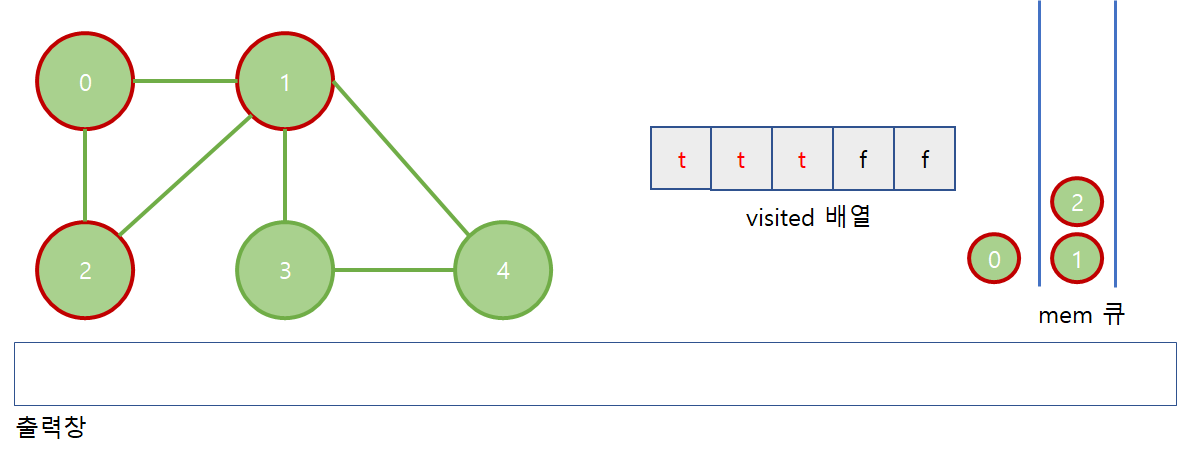 2. 큐에서 빼져있는 "0" 과 인접한 노드 "1" 과 "2" 를 큐에 차례대로 삽입한다.