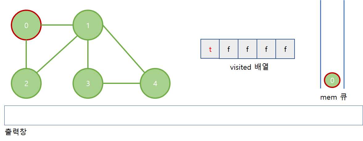 1. 시작 노드 "0" 을 큐에 넣는다.